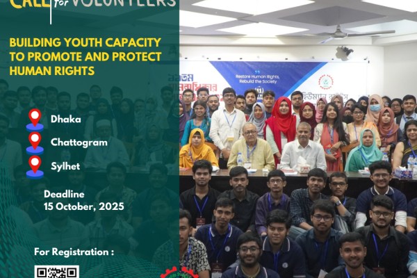 ০৩ টি জেলা থেকে "মানবাধিকার সুরক্ষা ও সমুন্নত করার জন্য যুব সচেতনতা ও সক্ষমতা তৈরি'' কর্মসূচী বাস্তবায়নে আগ্রহী যুব স্বেচ্ছাসেবকদের আবেদনপত্র আহ্বান করছে। ঢাকা, সিলেট ও চট্টগ্রাম জেলার প্রতিটি থেকে ৩০ জন করে মোট ৯০ জন স্বেচ্ছাসেবক নেয়া হবে।